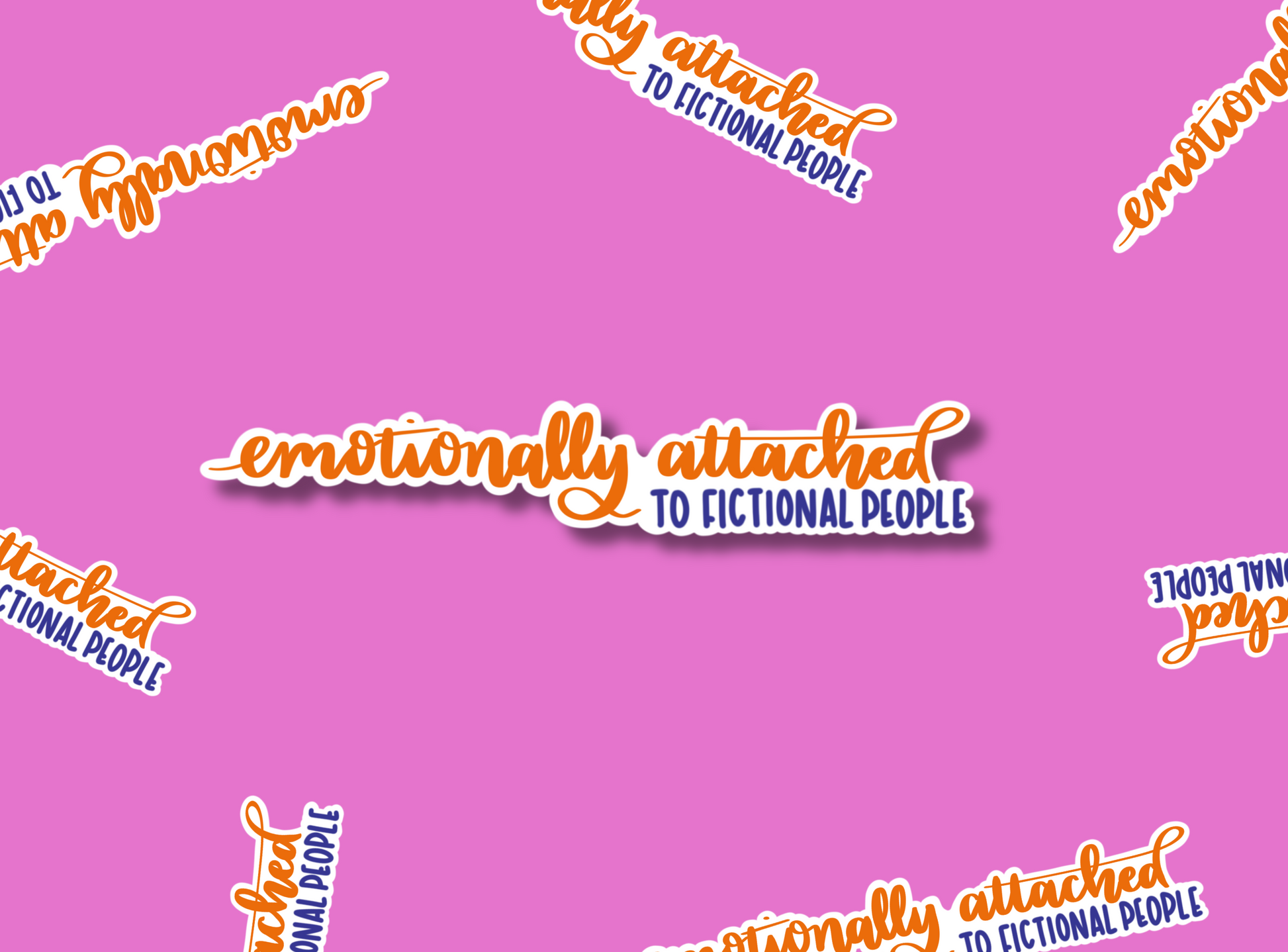 This listing is for one die cut sticker that says 'emotionally attached' in orange script lettering, and then 'to fictional people' underneath it in dark blue handlettered caps This sticker is printed on premium matte vinyl sticker paper and is 11.5 x 2cm at its widest and tallest.