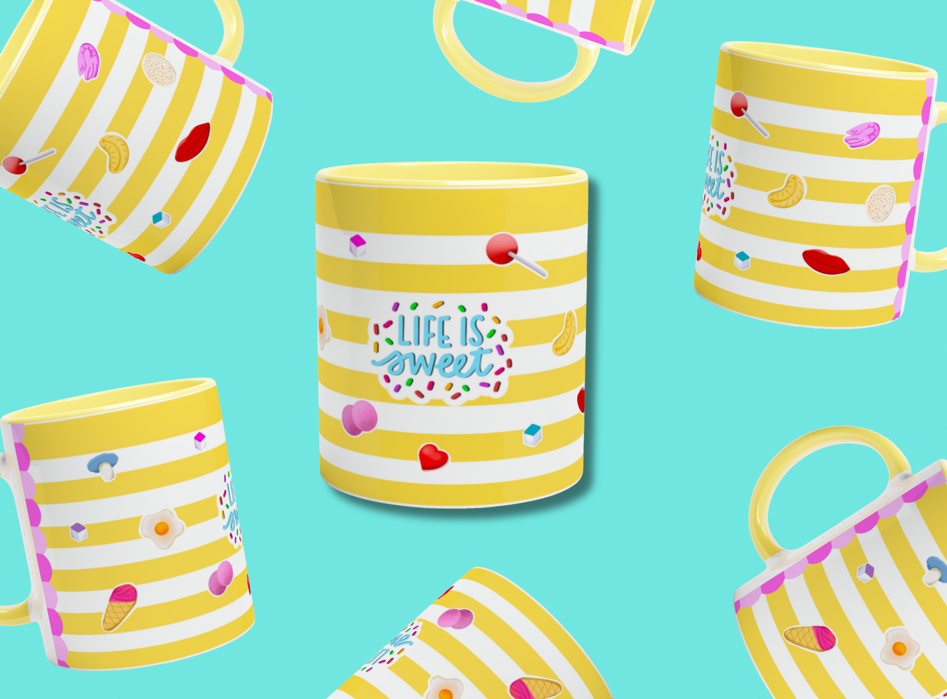 Life is Sweet is the latest addition to the Sweet Shoppe range, which includes matching stickers and greetings cards. The cup delivers a beautifully bold striped yellow and white design with pink bunting style edges, reminiscent of an old fashioned sweet shoppe. The slogan 'life is sweet' is in the centre of the cup surrounded by colourful confetti, and then various sweets are dotted around the cup.